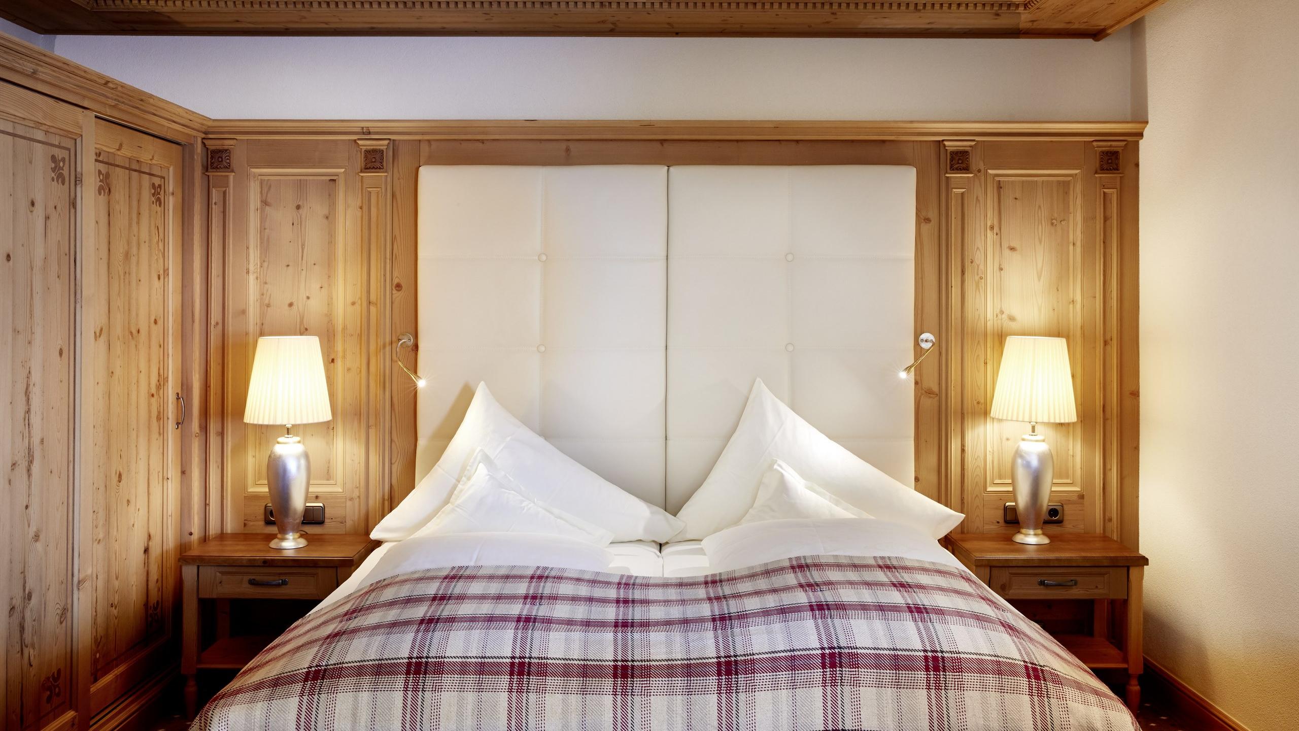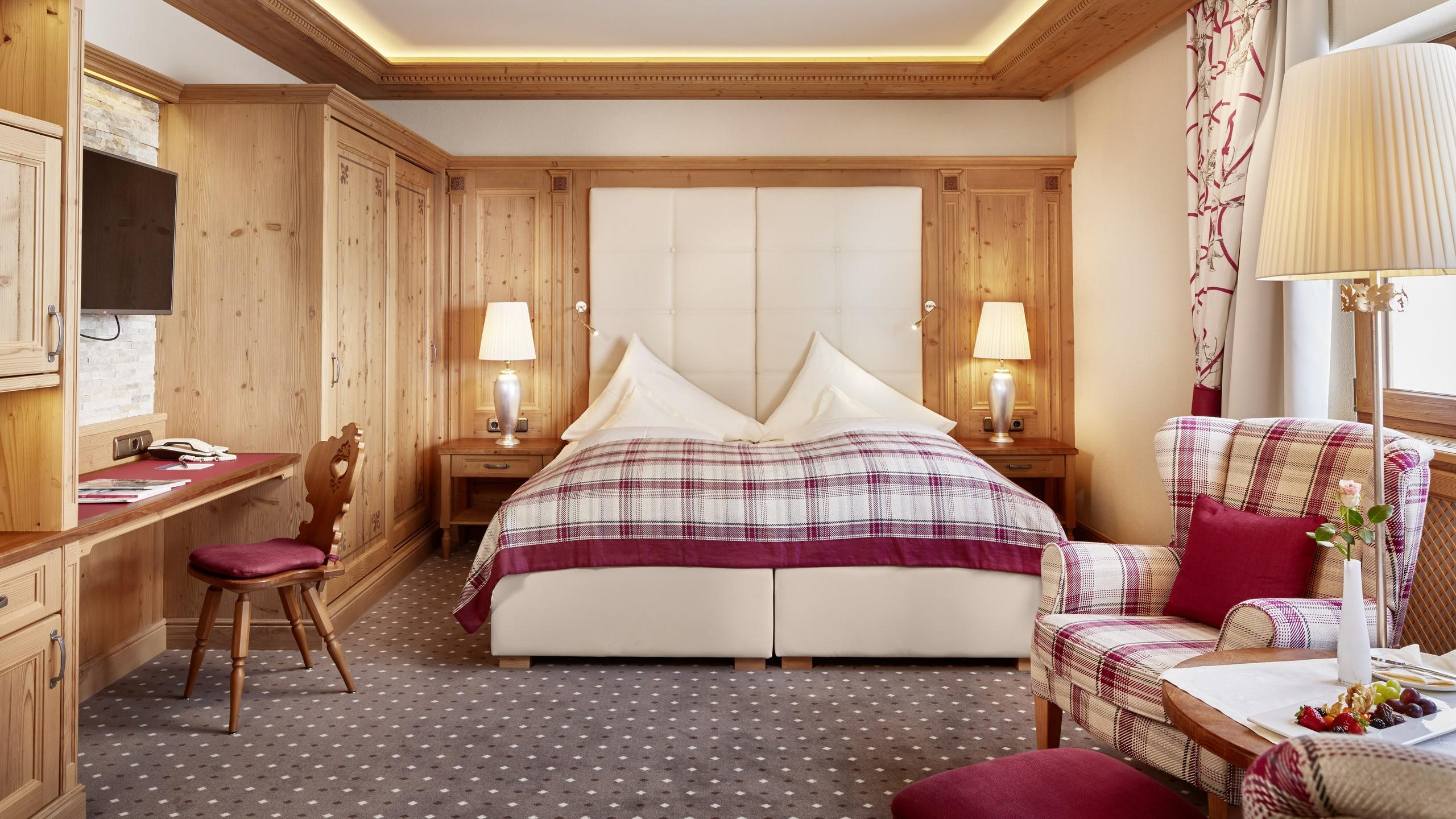 Especially high-quality deluxe double rooms in elegant Swiss stone pine or spruce wood with cosy living area and spacious bathroom with large bath and separate shower. These rooms are situated exclusively in a quiet location with a view of the Alpine meadows and ski slopes.