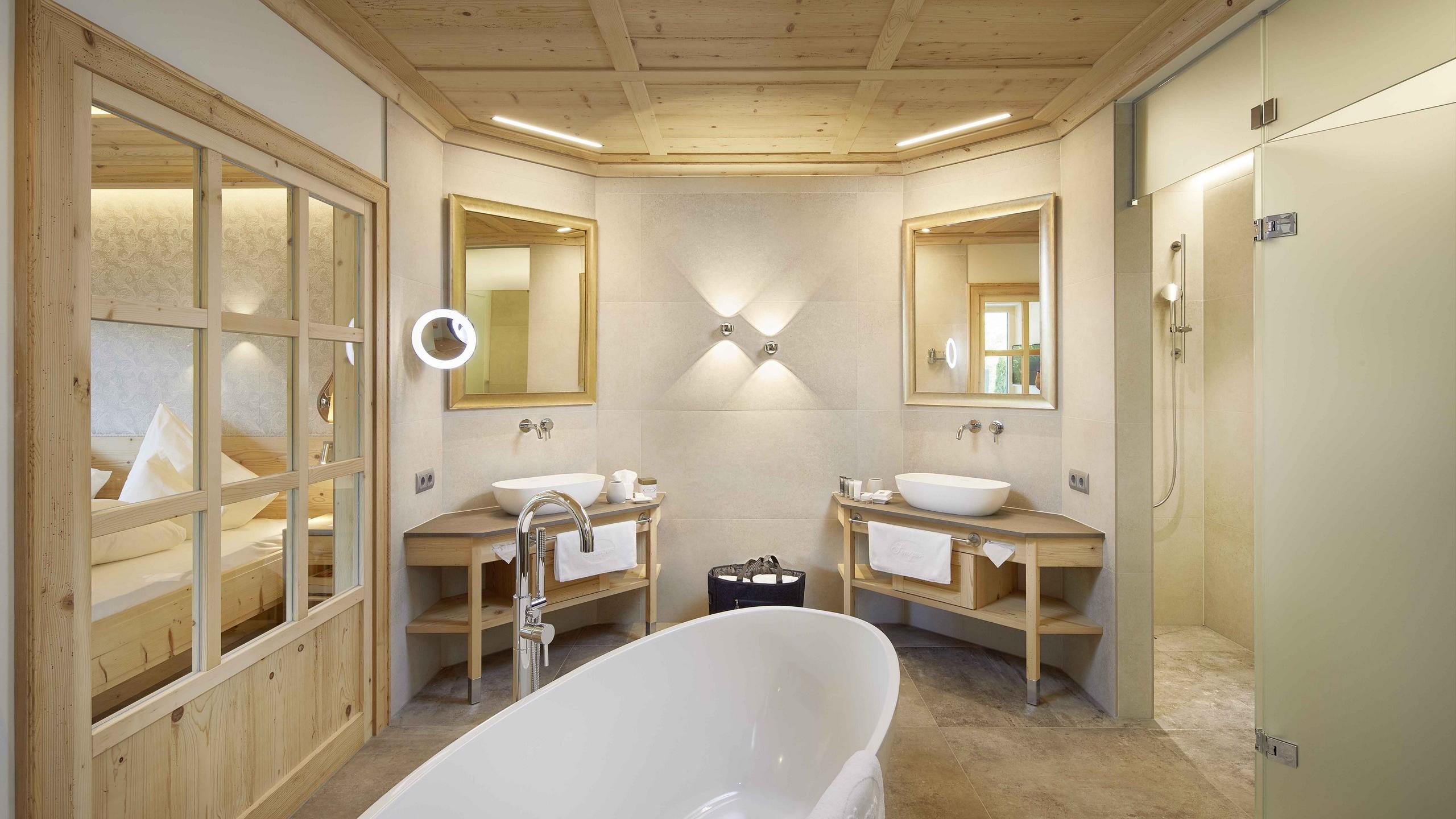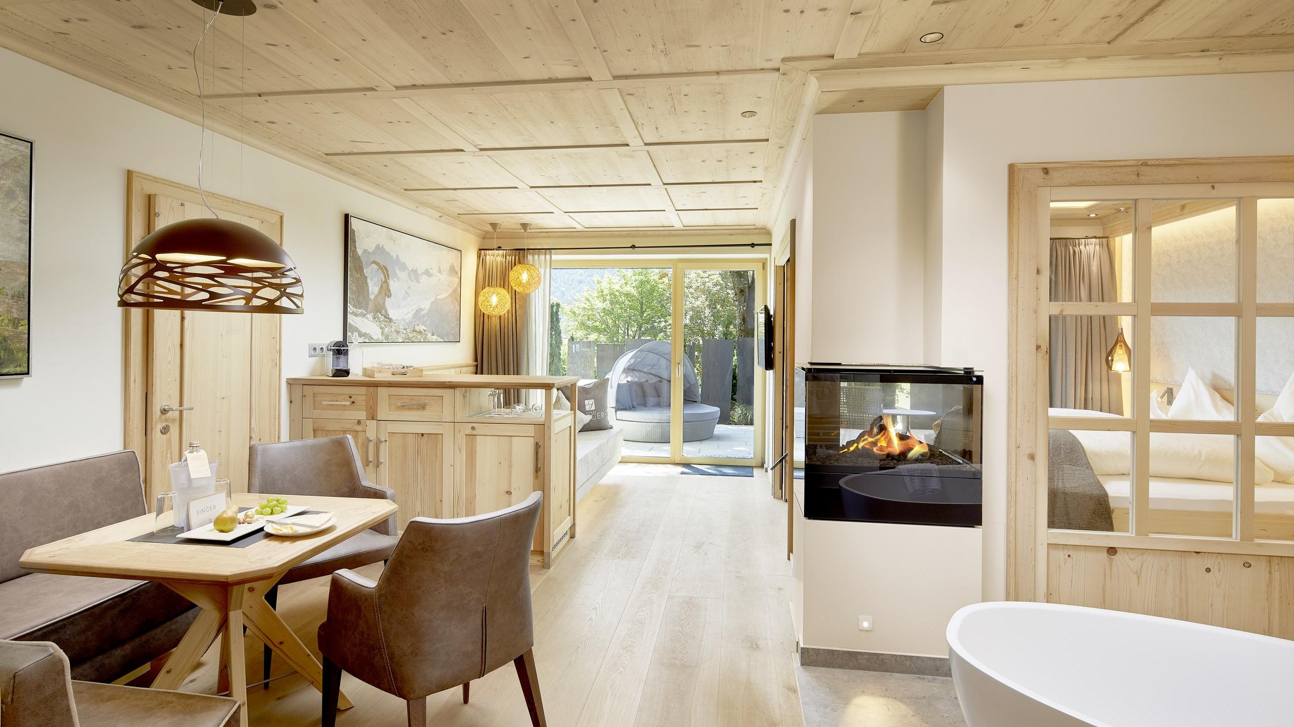 Features: Double bed | Floor-to-ceiling windows | Walk-in closet | Corner seating | Dining table | Minibar | Nespresso machine | Cosy couch | Private terrace with hot tub | Separate toilet | Free-standing bath | Walk-in shower | Double washbasin | Hairdryer | Bogner toiletries | SPA bag with bathrobe and slippers | Wi-Fi