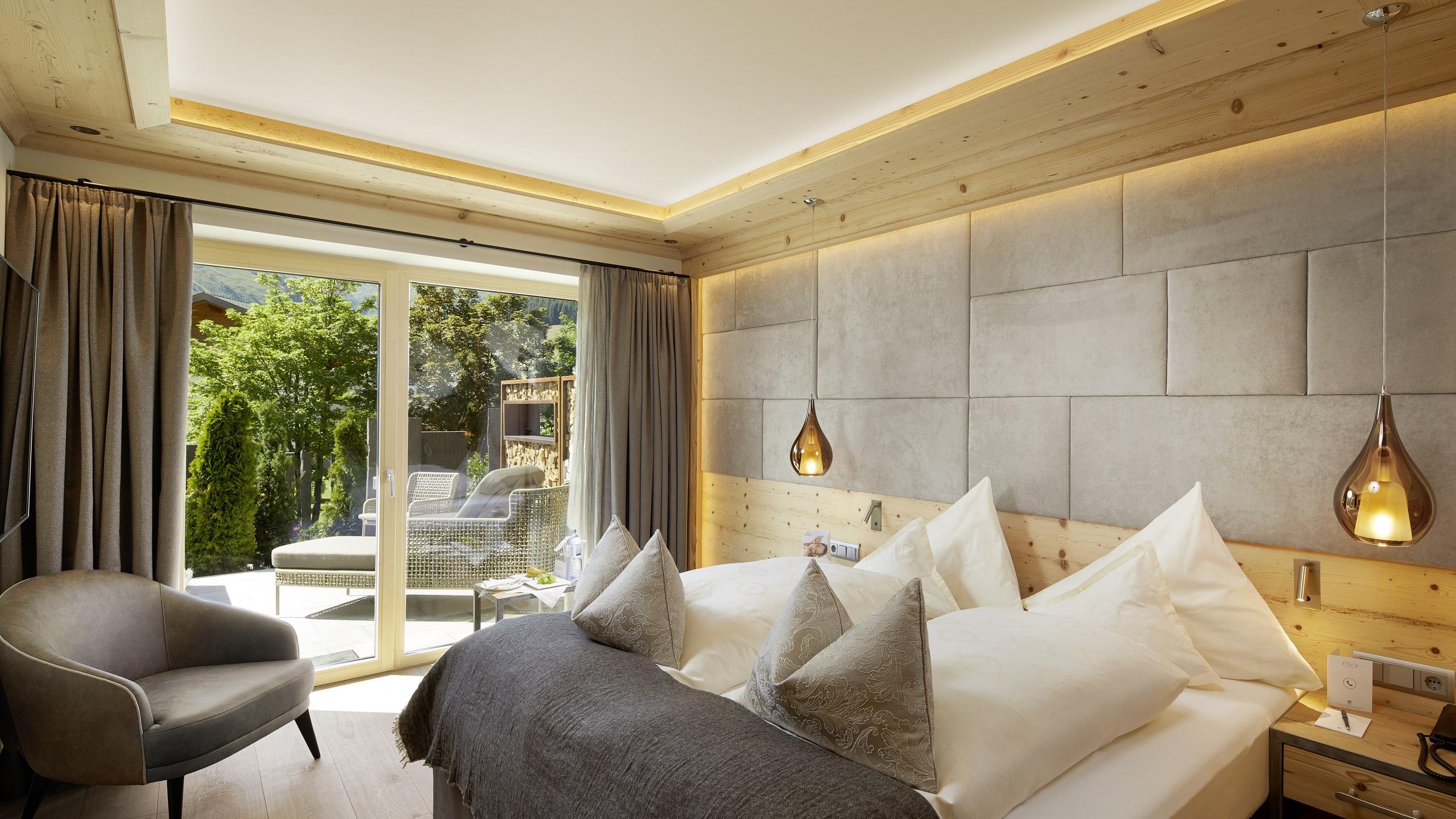 Features: Double bed | South-facing private terrace | Minibar | Toilet | Walk-in shower | Hairdryer | Bogner toiletries | SPA bag with bathrobe and slippers | Wi-Fi