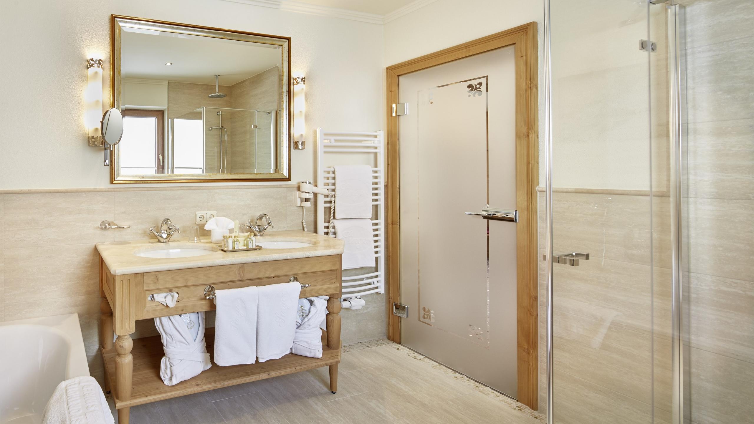 Uitrusting: tweepersoonsbed | woonhoek | toilet | bad | douche | föhn | toiletartikelen van Bogner | badtas met badjas en slippers | wifi