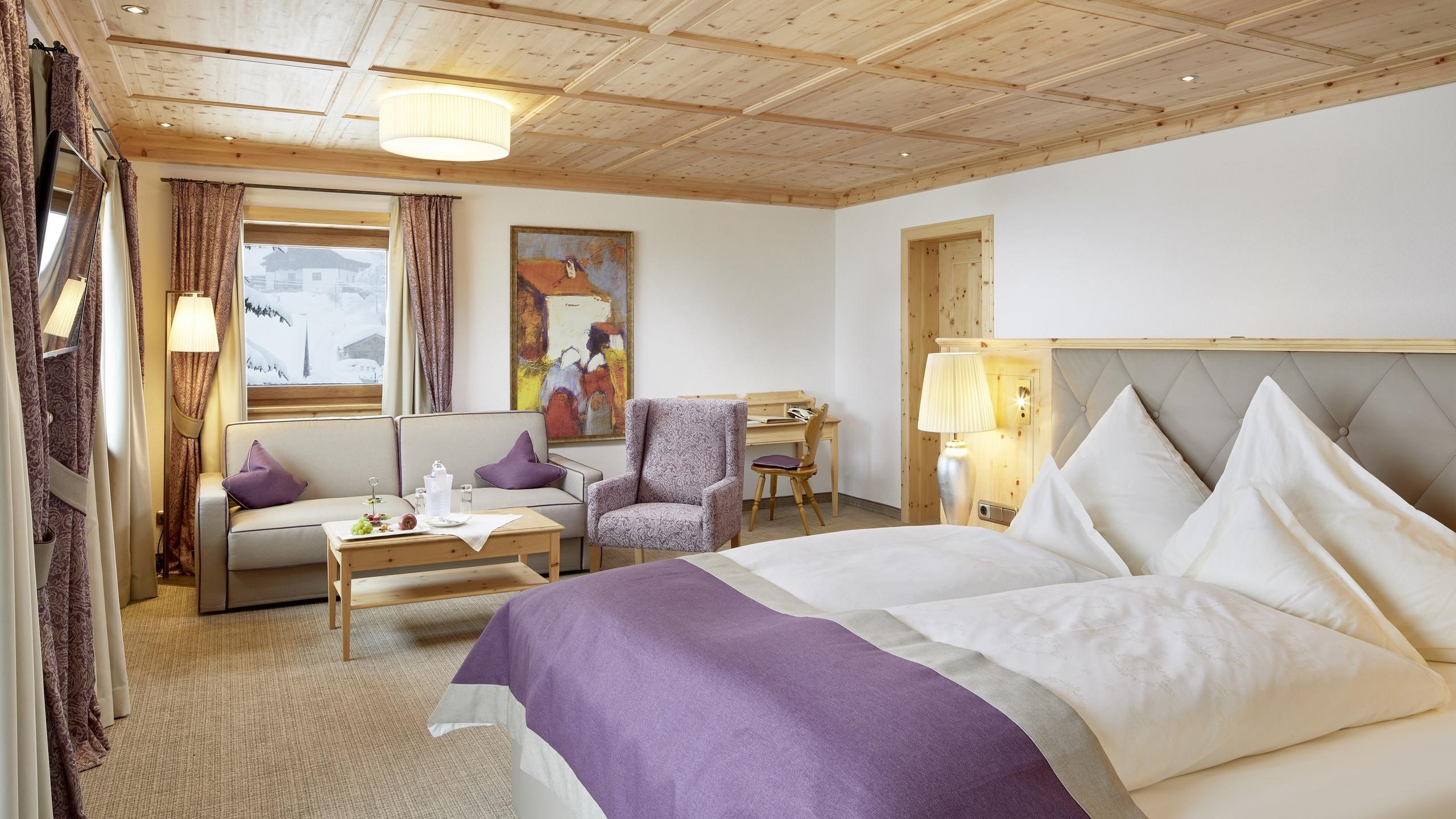 De Junior Suites in alpendennenhout, dat de kwaliteit van slapen verhoogt en de hartfrequentie verlaagt. Met gecombineerd woon- en slaapgedeelte, balkon op het zuiden en uitzicht op de prachtige bergen van de Lechtaler Alpen. Grote badkamer met bad, inloopdouche, dubbele wasbak en grotendeels gescheiden toilet.