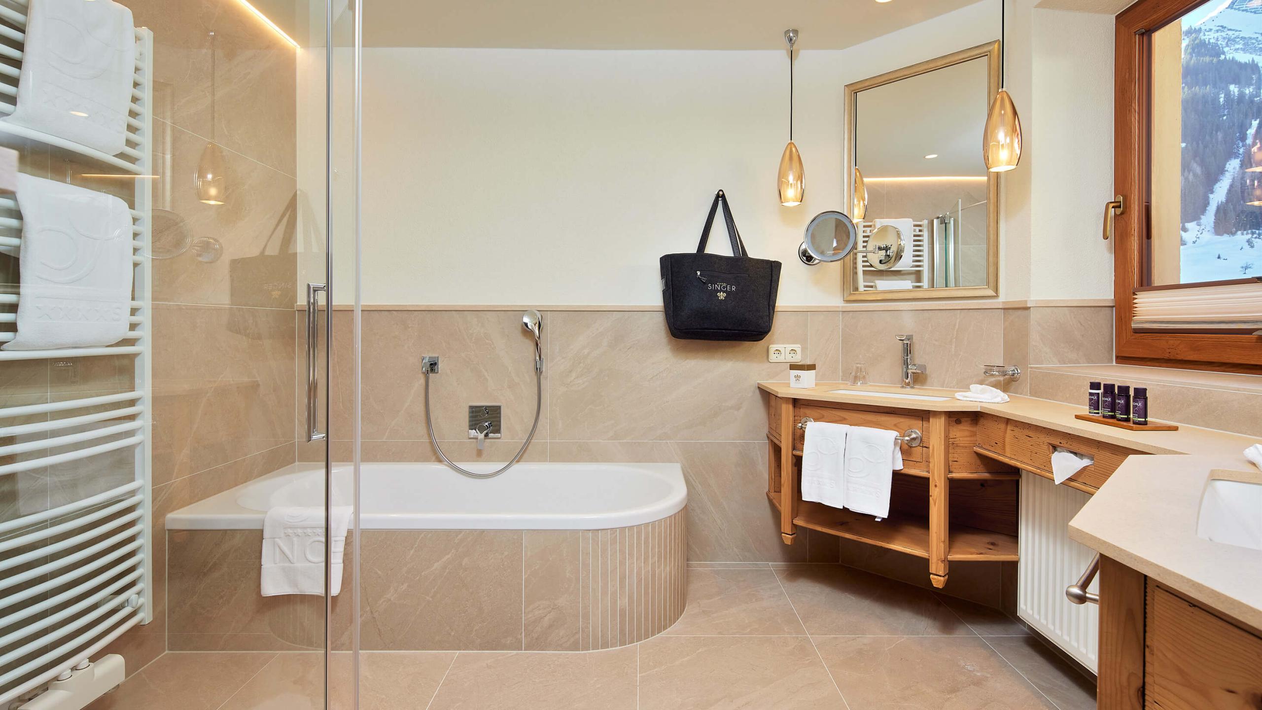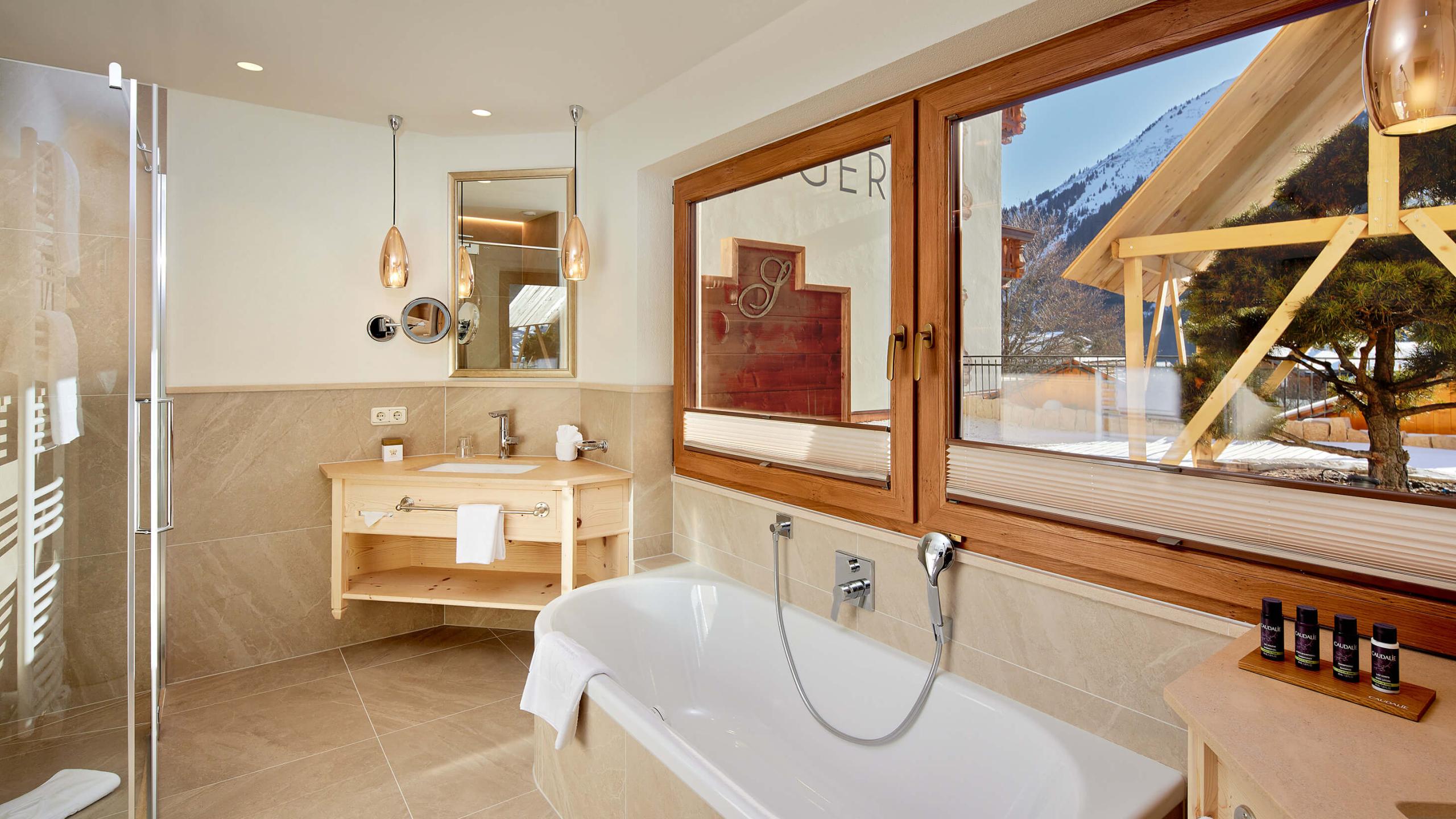 Deze Deluxe Junior Suites zijn betoverend met hun woonstijl met veel oud sparrenhout en dankzij hun adembenemende uitzicht vanaf het zonnige balkon op het zuiden. De badkamers zijn van chic Portogallo-marmer en beschikken over een grote ronde badkuip en een dubbele wastafel.