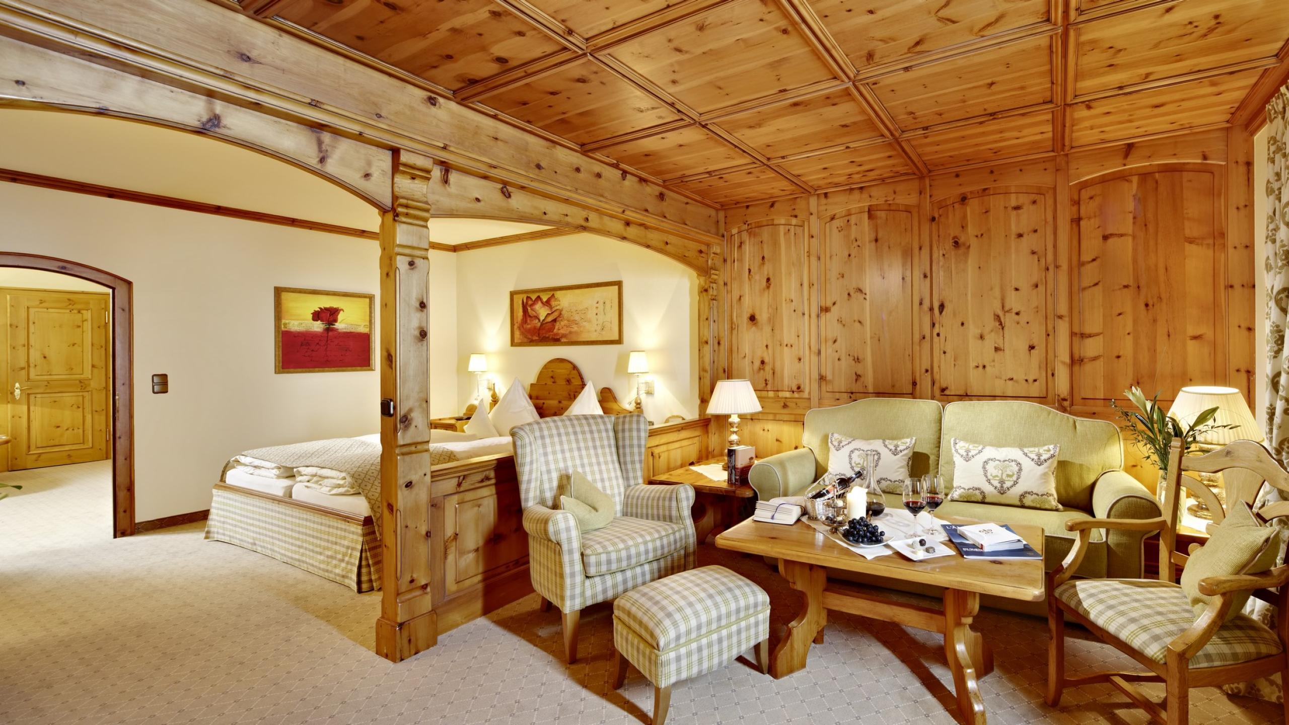 Royale Familie Junior Suites met grote entree, optisch gescheiden woon- en slaapkamer van Tirools alpendennenhout en een grote badkamer met bad, douche en gescheiden toilet. Ze hebben ook een bureau en een inloopkast. Op de koop toe krijgt u een rustige ligging en uitzicht op de bergweiden.
