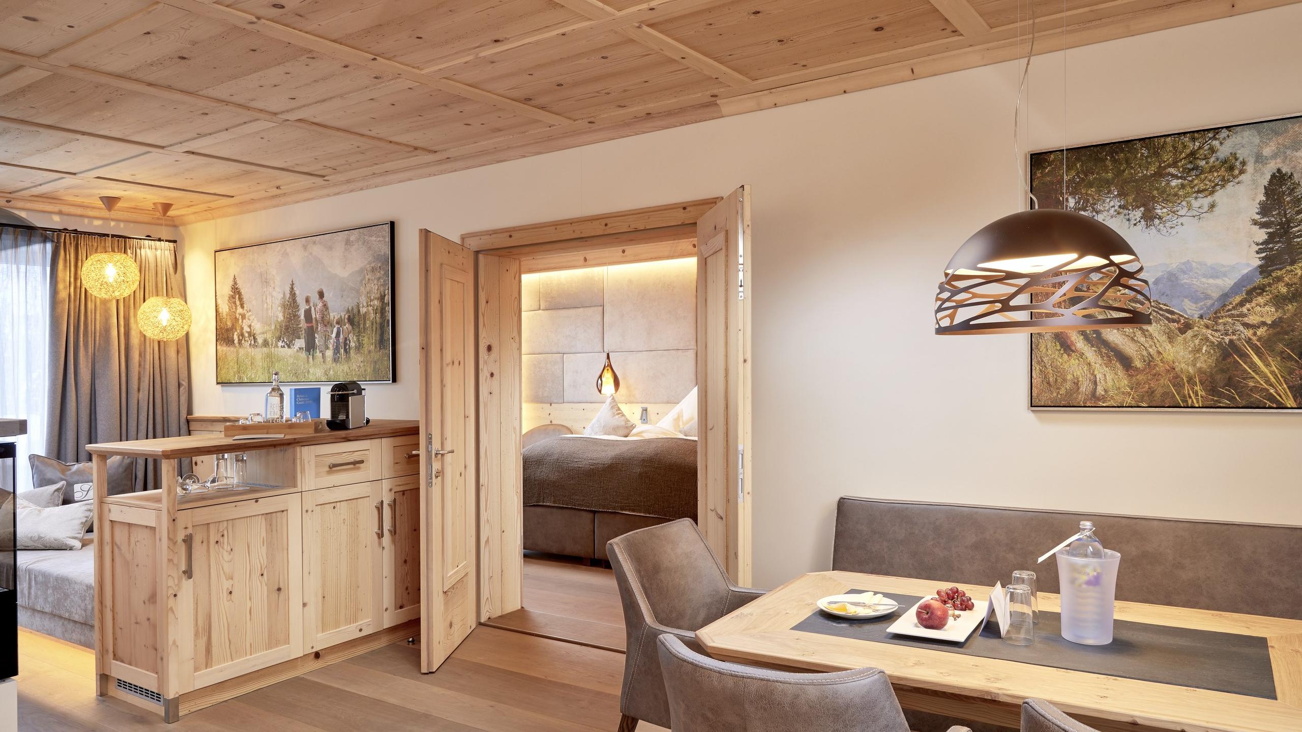 Ruime suites met gezamenlijke woonkamer en 2 gescheiden slaapkamers. De een slaapkamer met open badkamer met vrijstaand bad, dubbele wastafel, inloopdouche en gescheiden toilet, de andere slaapkamer met een lichte badkamer met grote inloopdouche. Kamerhoge ramen bieden een fantastisch uitzicht op het berglandschap en het privéterras (ca. 50 m²) met exclusieve hot tub.