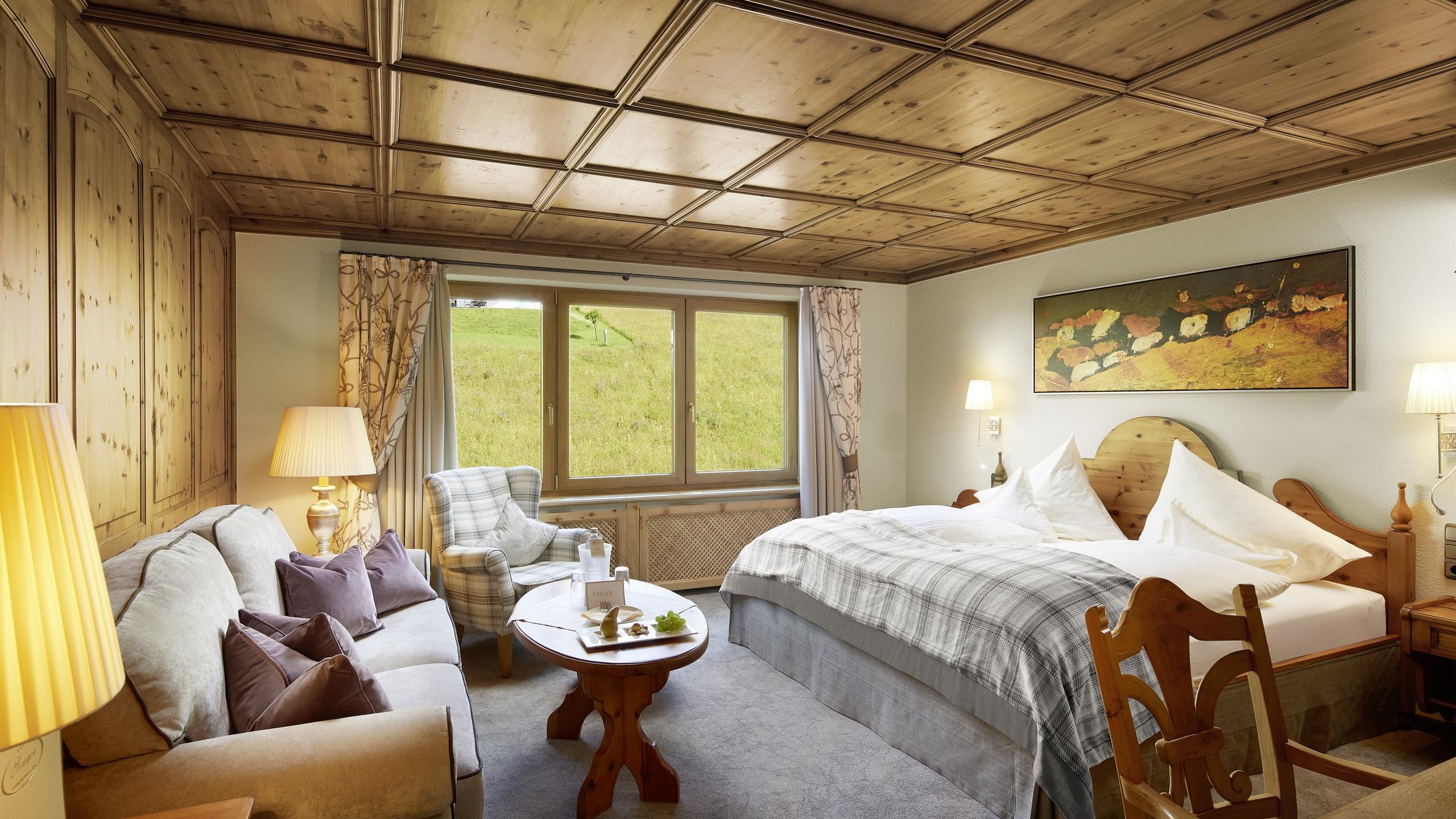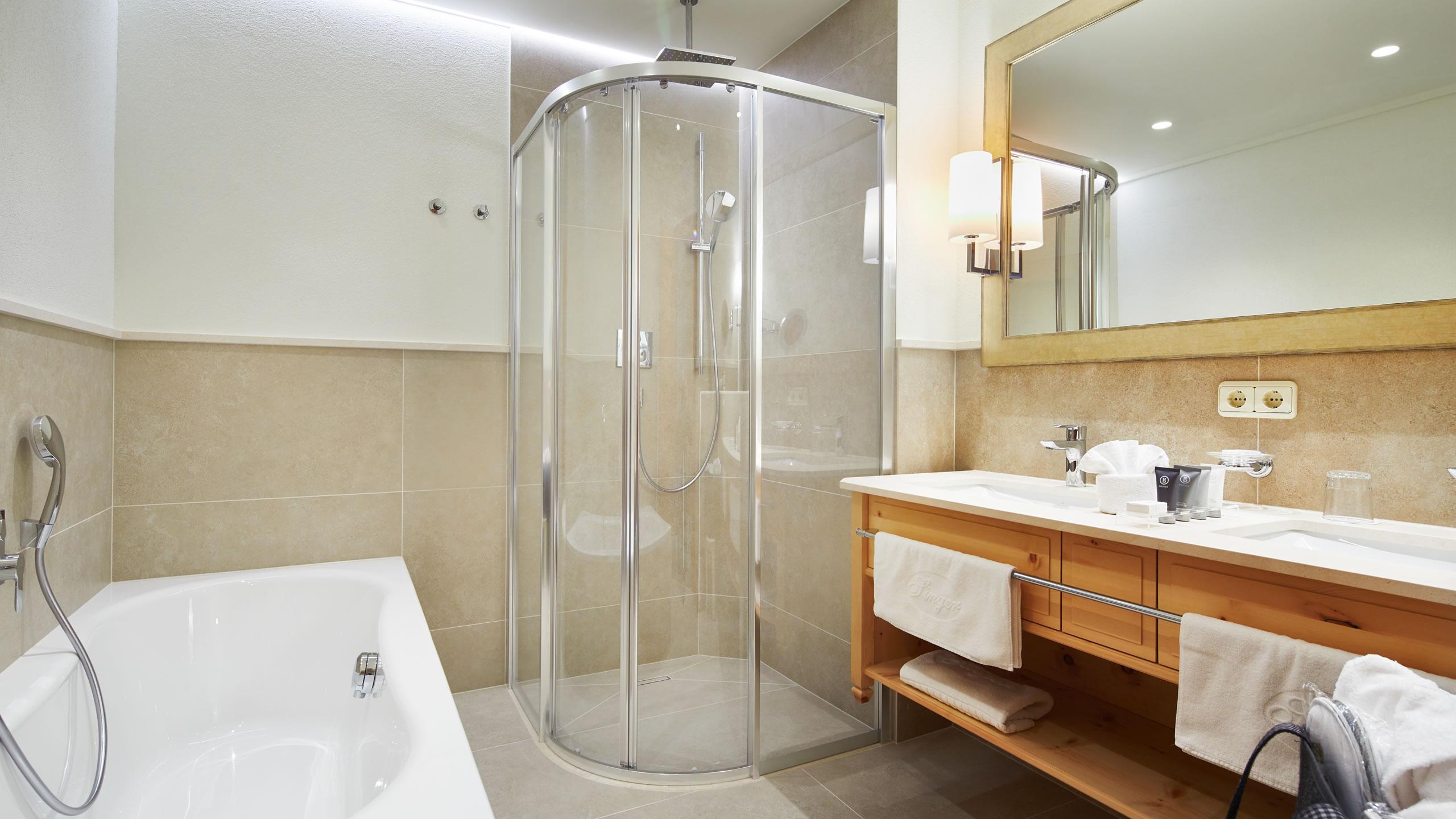 Ausstattung: Doppelbett | Einzelbett | Schrank | Wohnbereich | Minibar | Separates WC | Doppelwaschtisch | Badewanne | Separate Dusche | Föhn | Pflegeartikel von Bogner | Badetasche mit Bademantel und Badeschuhen | WLAN